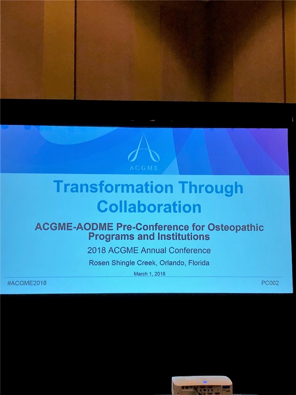 For example, the ACGME has partnered with the AODME (Association of Osteopathic Directors and Medical Educators) to create and host this pre-conference. An exciting change this year is that the AODME has reconcepted as AOGME (Assembly of Osteopathic Graduate Medical Educators) and is now integrated into AACOM.