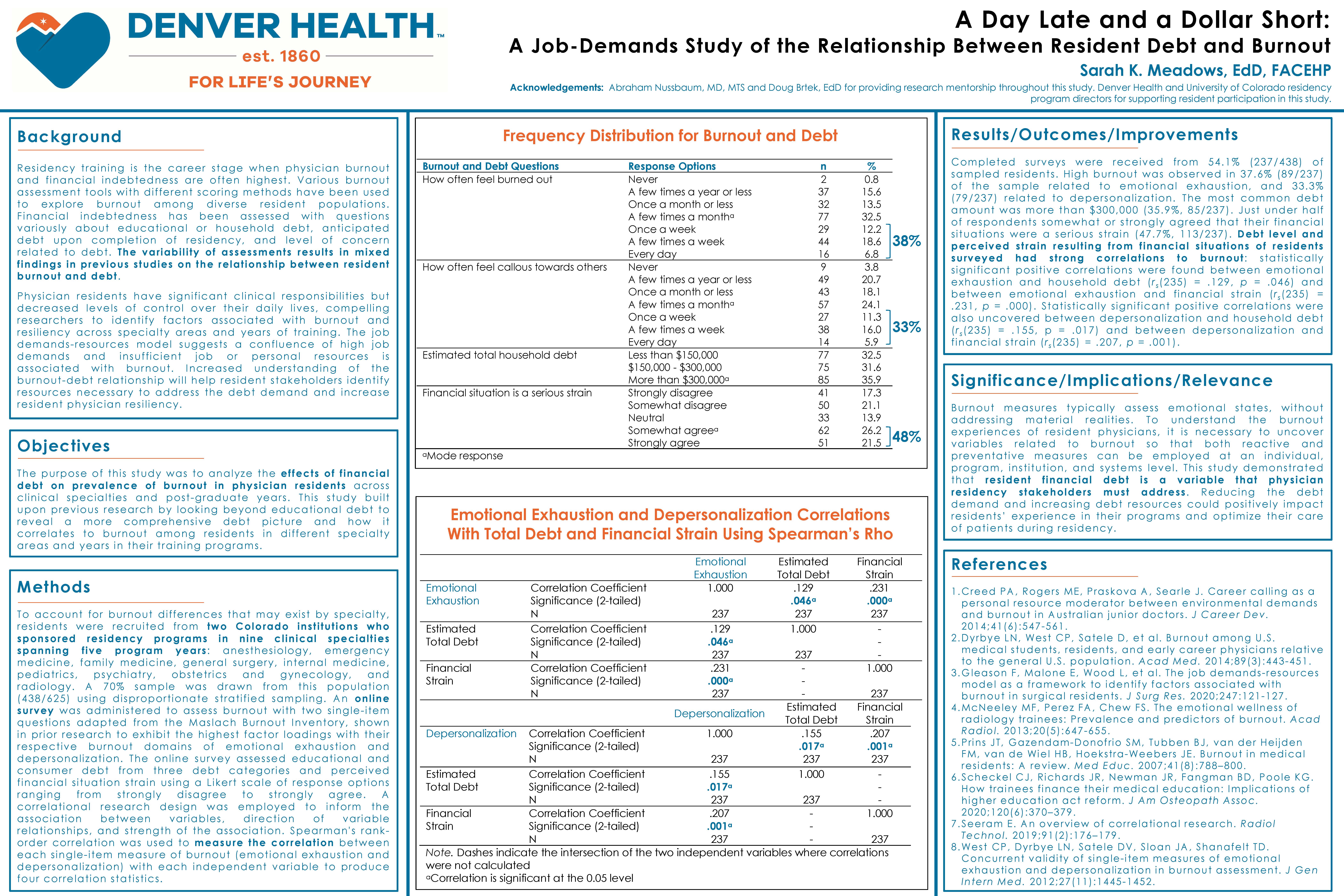 Meadows: In this study, I analyzed the effects of financial debt on prevalence of burnout in physician residents across nine clinical specialties and five post-graduate years in two Colorado institutions. This study built upon previous research by looking beyond educational debt to reveal a more comprehensive debt picture and how it correlates to burnout among residents in different specialty areas and years in their education programs. Four-hundred thirty-eight (438) residents were recruited to participate in an online survey assessing burnout, debt level, and perceived financial situation strain. A correlational research design was employed to inform the association between variables, direction of variable relationships, and strength of the association.