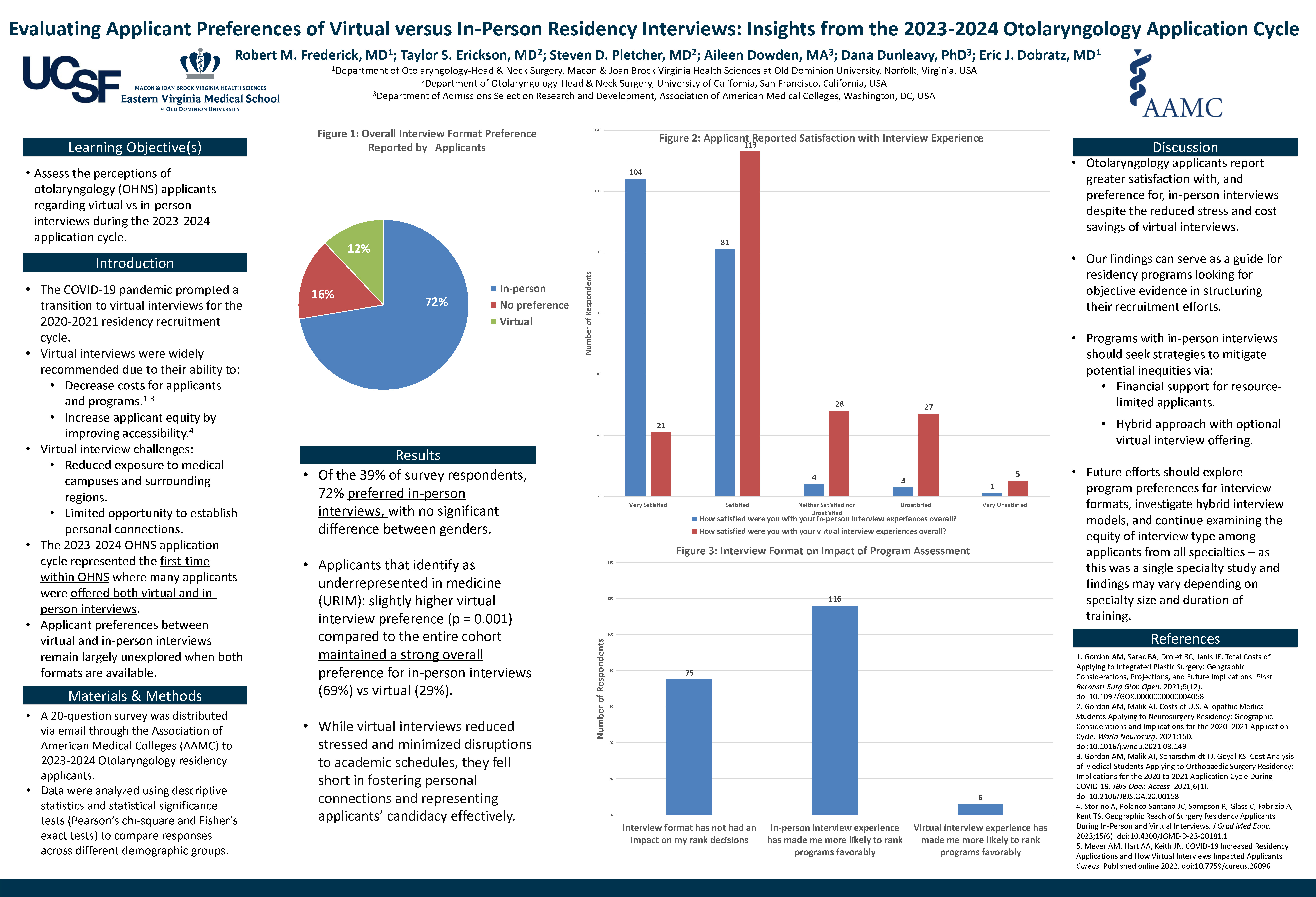 Dr. Robert M. Frederick and his team assessed the perceptions of otolaryngology applicants regarding virtual versus in-person interviews during the 2023-2024 application and residency recruitment cycle, which was the first time many applicants were offered both virtual and in-person interviews. Dr. Frederick presented the findings in a poster presented at the 2025 ACGME Annual Educational Conference, held February 20-22, 2025, in Nashville, Tennessee