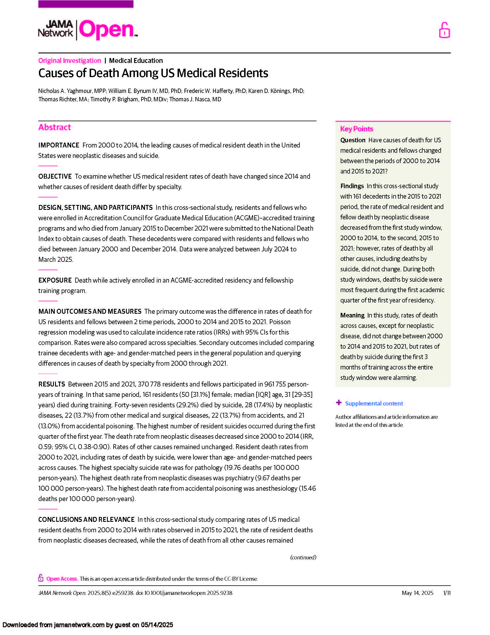 Study Published in JAMA Shows Leading Causes of Death Among Residents and Fellows in the US