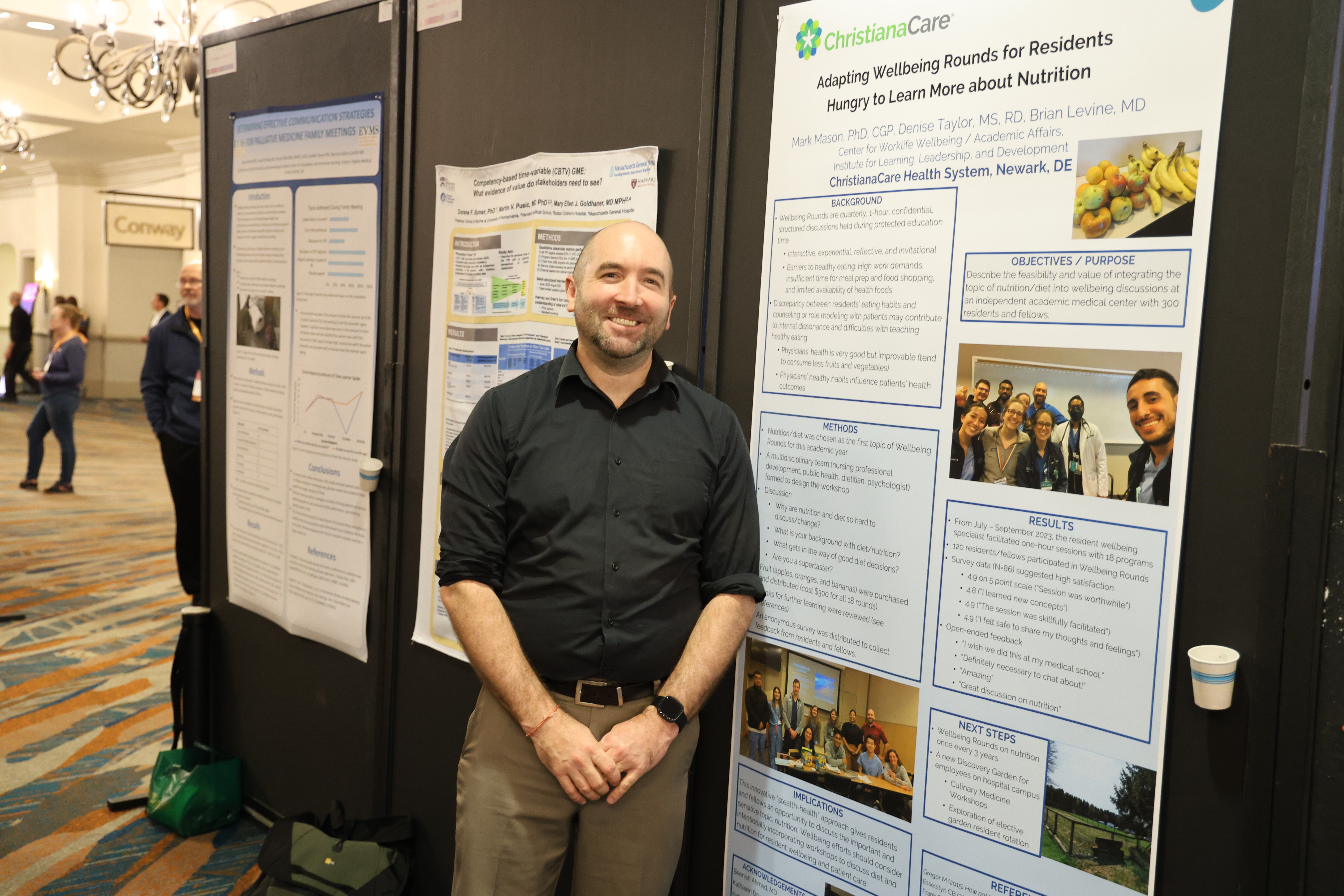 In the poster, “Adapting Well-Being Rounds to Residents Hungry to Learn More about Nutrition,” Mark Mason, PhD, CGP and his team explore the impact of open, honest conversations about nutrition and diet on learner physicians.